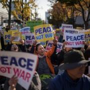 "We oppose war! Negotiate peace!" the protesters chanted in central Seoul, waving banners and balloons emblazoned "Peace, not war" and "We want peace".
