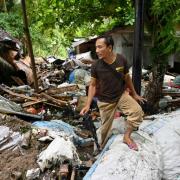 In devastated Sukarame village, Sunarti waded through knee-deep water as she searched for belongings outside her destroyed house -- and waited for aid to arrive.